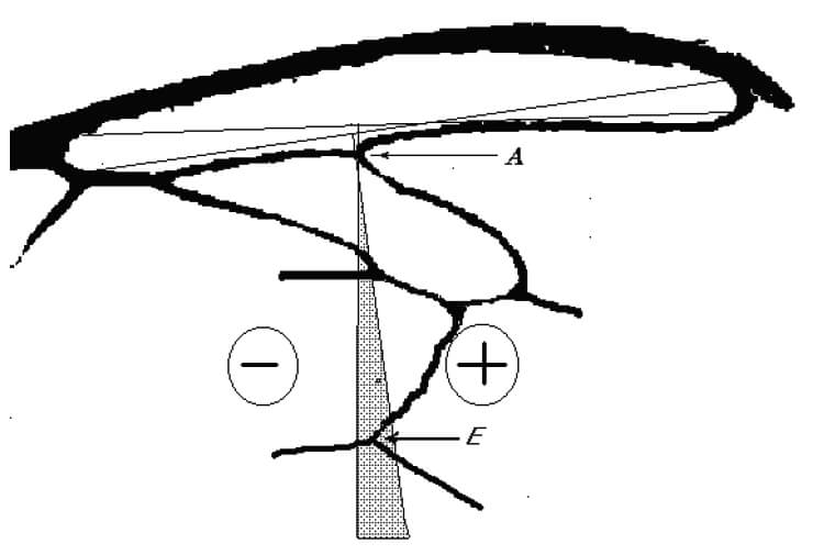 Методика Гетце-Алпатова [2] измерения дискоидального смещения рекомендует следующее: длину радиуса (исследуемой оси радиальной ячейки) принимаем за 100% (см. рис.1). Смещение точки «Е» вправо («+») или влево («-») относительно перпендикуляра выражается в процентах, %. Измерительную сетку передвигают до совмещения горизонтальной линейки с радиусом, а вертикальную линейку проводят через точку «А». Этот признак также связан с гантельным и базисным индексами, величина которых зависит от расположения точки «A».