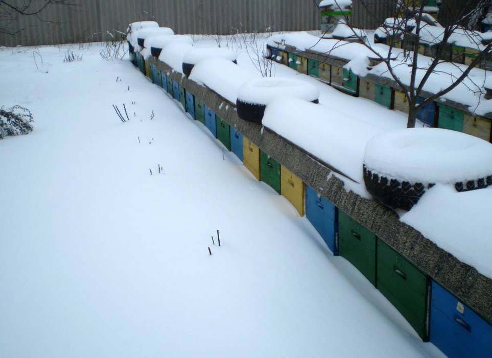 Отверстие для выхода углекислоты остается открытым при утренних температурах до —25—30°С. При более низких в гнезде усиливается шум. Это указывает на то, что пчелам стало холодно, в таком случае перекрывается легкими моховыми пробками каналы, и шум ослабевает. В конце февраля, когда первые капли начинают падать с крыш, освобождаются ульи из-под снега, расставляются на летние места в конце марта. Летки в зимнее время держатся открытыми на 2—3 см (верхние летки закрыты).