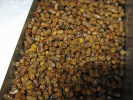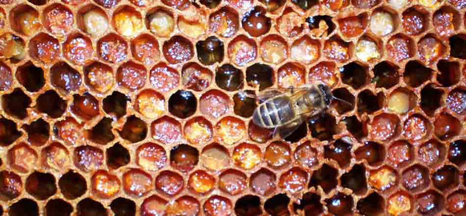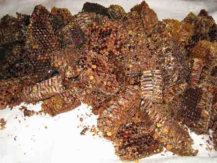Предварительно была проведена работа по выкачиванию меда из рамок на медогонке и соты обсушены пчелами. В нашем случае будем использовать сотовый лом, с наибольшим количеством ячеек заполненными гранулами перги.