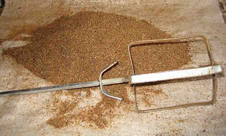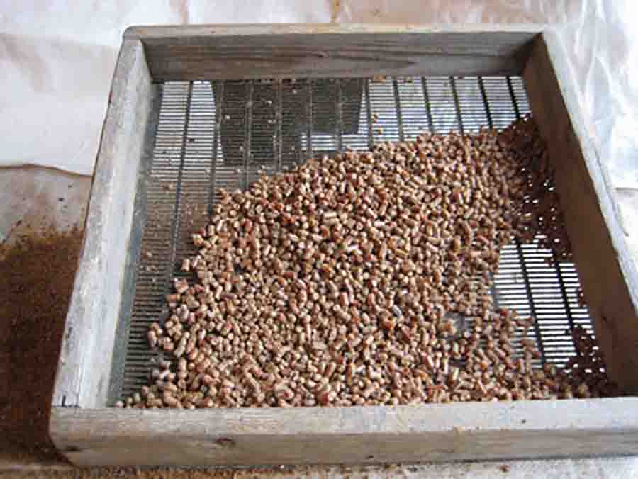 После того, как нашим устройством измельчили сотовый лом, содержимое бидона высыпаем на сито. Отделение перги от воска переходит в завершающую стадию. Просеиваем воск через сетку сита. Измельчённый воск легко проходит через сетку нашего самодельного сита. Гранулы перги остаются наверху.