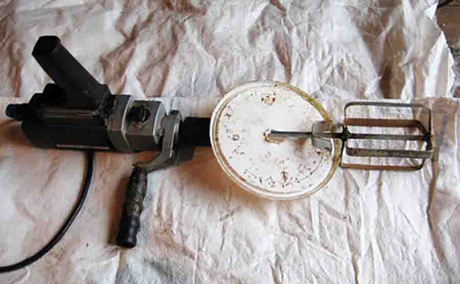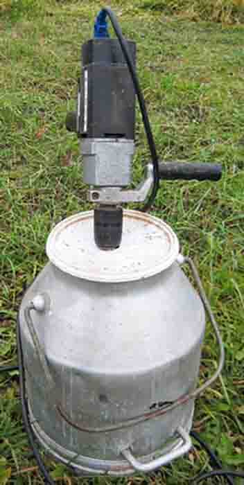Закрепляем крышку на бидоне, включаем электрическую дрель, пошел процесс измельчения сотового лома, гранулы перги начинают отделяться от воска. Чтобы охватывать всё пространство в бидоне, держась за ручки дрели, делаем круговые и поступательные (верх-вниз) движения дрелью внутри бидона.