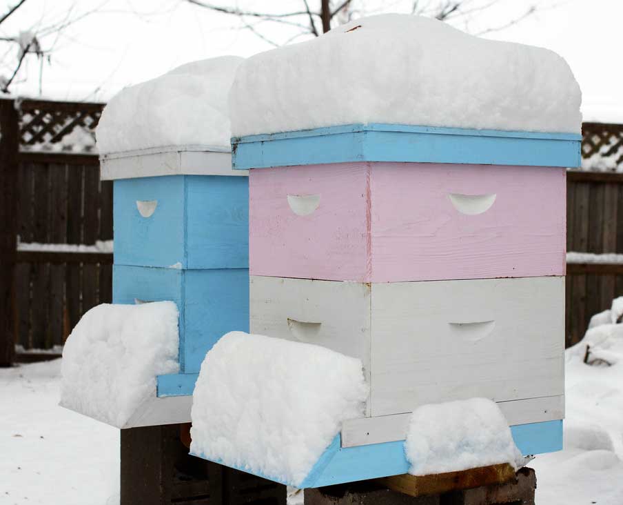 Самое простое решение — это поставить улей на магазинную надставку или ящик, заполненные стружкой, соломой, мхом, сухими сосновыми иголками, пенопластом. Древесные опилки не использовать, т.к. они быстро набирают влагу и замерзают. В этот период открыты только нижние летки (на 2 см) и они должны быть недоступны мышам и синицам. В конце месяца, в ульях с верхним летком, его открыть, а нижний закрыть. Желательно в это время дать под холстик зимующим семьям 1-2 кг канди с добавлением сока чеснока, алоэ, витамина В12, кобальта, ноземата, настойки хвои в целлофановом мешочке (пакете), сделав иглой несколько проколов.