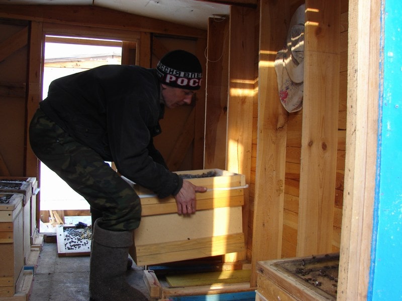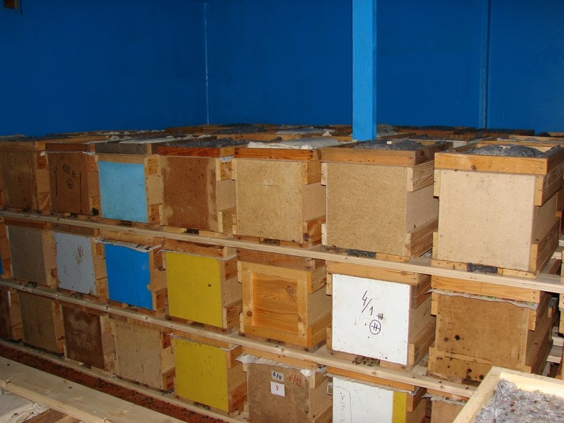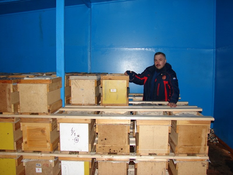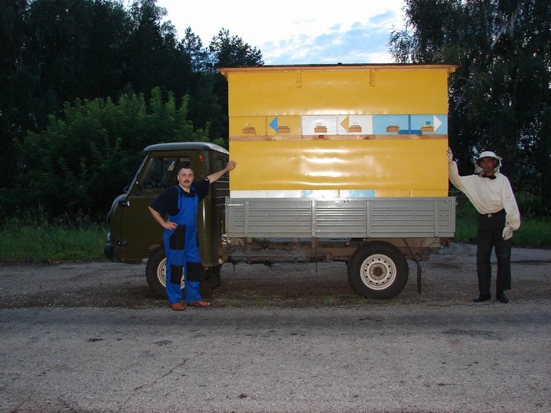 Павильоны очень компактны и при необходимости их можно достаточно много установить на небольшой территории. Так, осенью мы свозим их на зимовку и размещаем 20 павильонов на 4 сотках земли. При кочевке на расстояние 30-40км один водитель у нас перевозит за ночь от 3 до 5 павильонов, в зависимости от дорожных условий. Летки при таких переездах мы не закрываем, это исключает запаривание семей и трату времени на их подготовку, при этом пчелы ведут себя гораздо спокойней, чем при полной изоляции их в ульях.